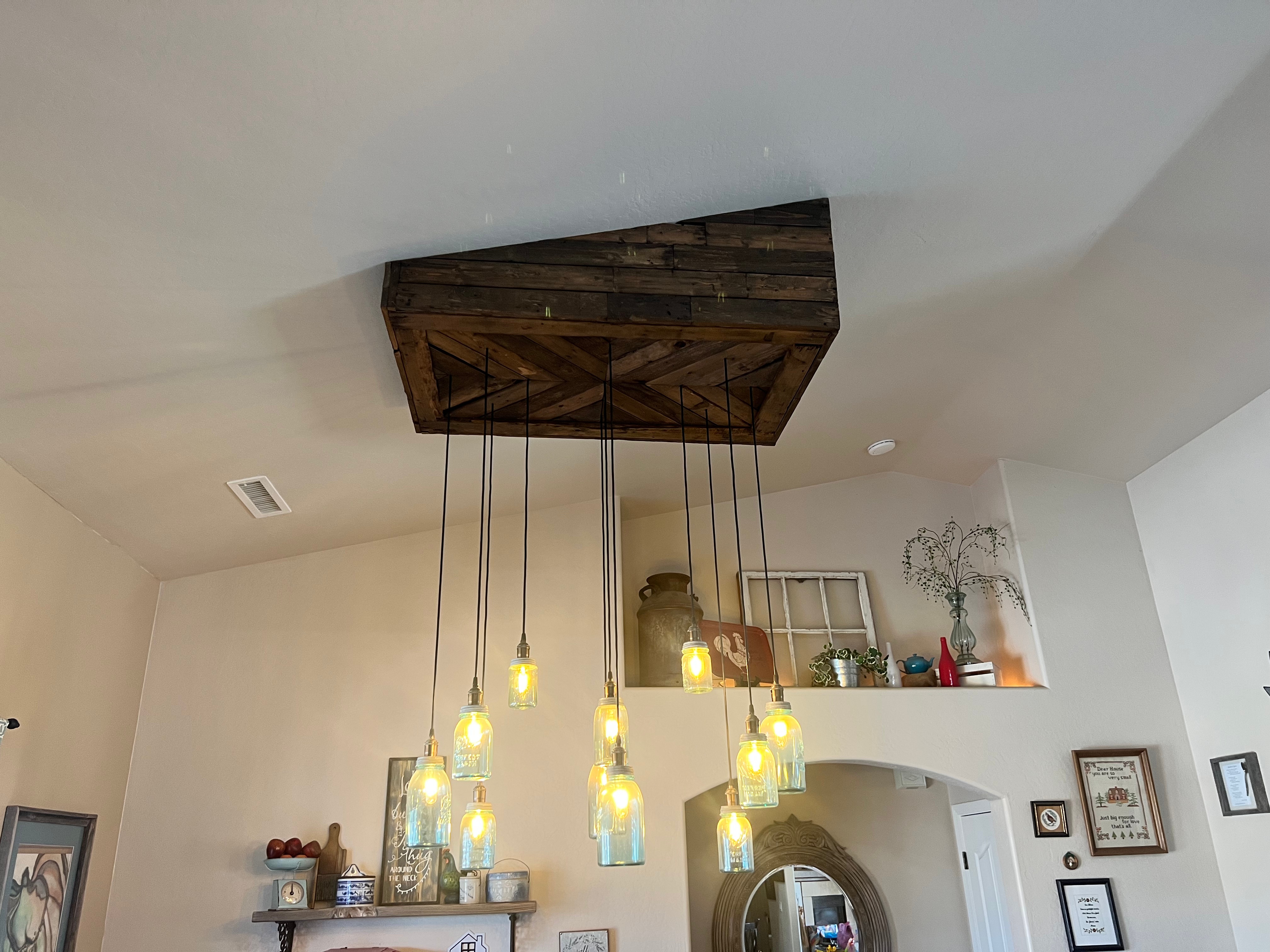 - Custom light fixture with barnwood and mason jars